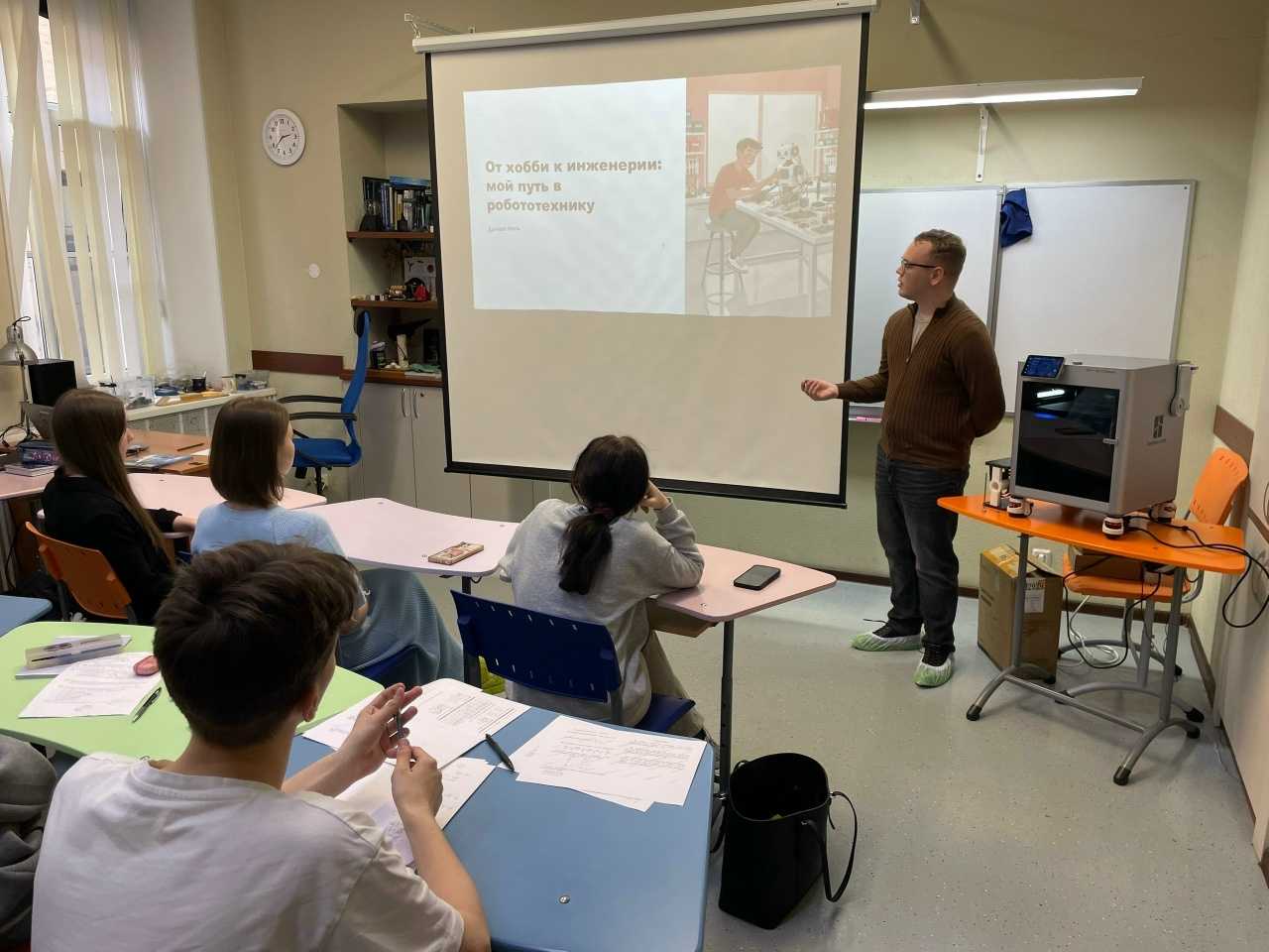 Даниил познакомил учащихся с интереснейшими аспектами своей работы в области робототехники и мехатроники и продемонстрировал возможности 3D-принтера. Ребята воочию увидели, как цифровая модель превращается в реальный, осязаемый предмет. Даниил продемонстрировал им множество разнообразных объектов, напечатанных им на 3D-принтере.